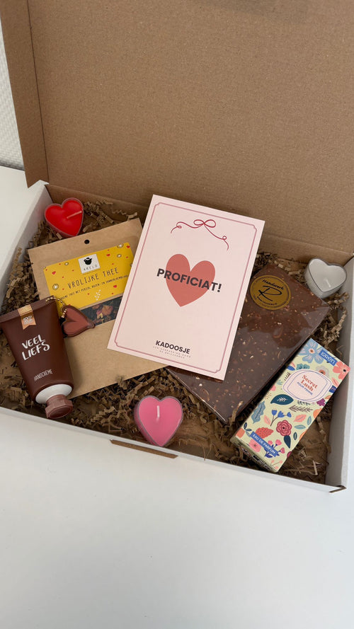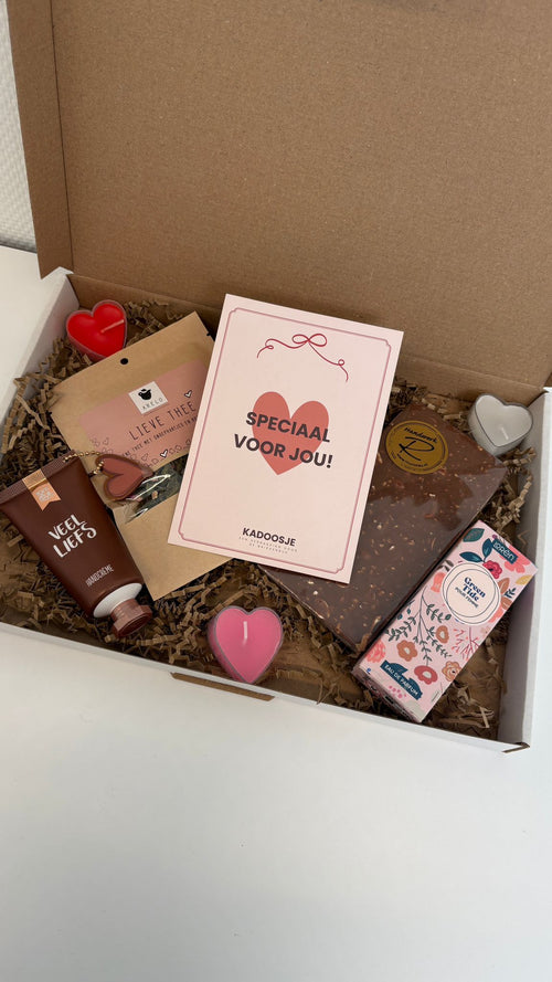 Het doosje is met zorg samengesteld, mooi verpakt en past door de brievenbus. Het doosje is gevuld met een Rousseau pindarotsjes reep, een parfum, een leuke handcrème, lekkere thee, kaarsjes en om het helemaal af te maken kunt u zelf een persoonlijke boodschap toevoegen om jouw verassing nog persoonlijker te maken.
